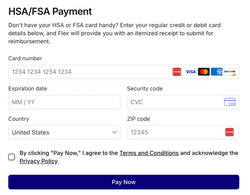 If you don’t have your HSA or FSA card handy, still select “Flex | Pay with HSA/FSA” as your payment method. Enter your credit card information and Flex will email you an itemized receipt to submit for reimbursement.