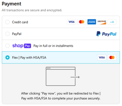 To use your HSA or FSA debit card, add products to your cart as usual. At checkout, select Flex | Pay with HSA/FSA as your payment option, confirm your eligibility, and enter your HSA or FSA debit card, complete your checkout as usual. If you don't have your HSA or FSA card handy, you can enter credit card information and Flex will email you an itemized receipt to submit for reimbursement.